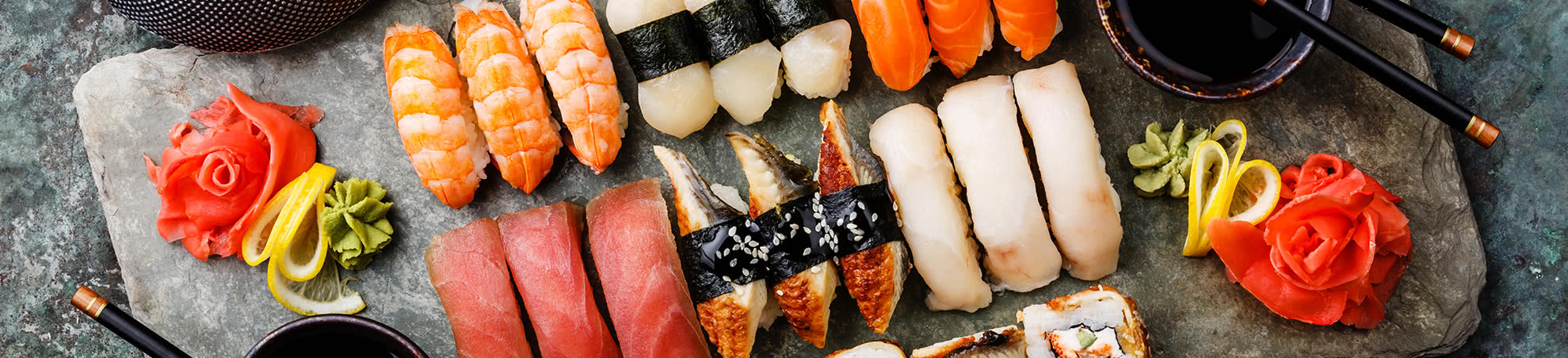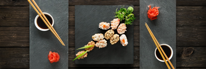 Gefüllt mit Lachs, Gurke, Avocado, Tobiko (Fliegenfischrogen). Tobiko ist ersetzbar durch Sesam
